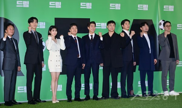 배우 김종수, 박서준, 아이유, 정승길, 이현우, 양현민, 홍완표, 허준석, 감독 이병헌이 30일 서울 성동구 성수동 메가박스 성수점에서 열린 영화 ‘드림’ 제작보고회에서 포즈를 취하고 있다.