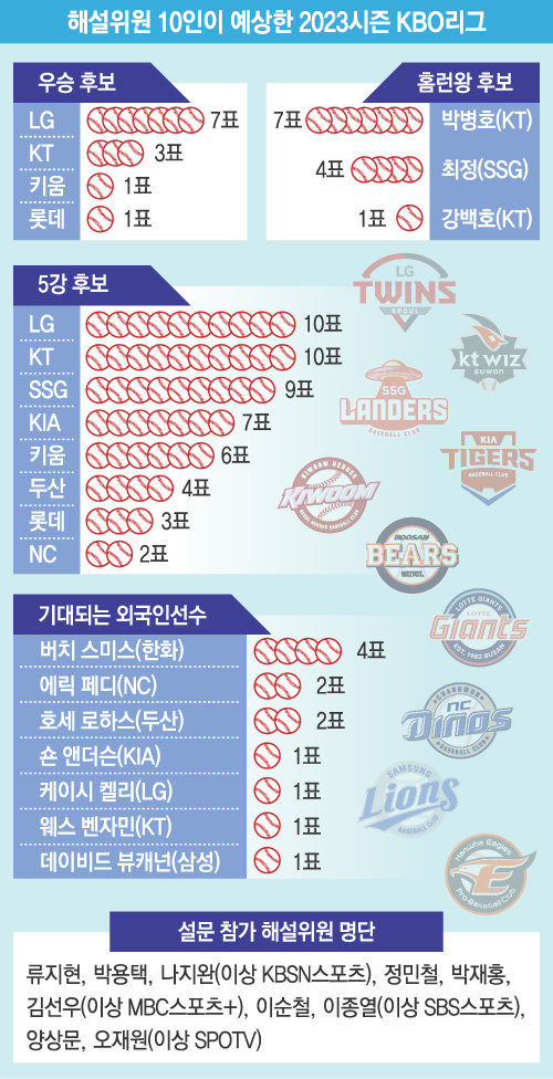 스포츠동아는 4월 1일 ‘2023 신한은행 SOL KBO리그’ 개막에 앞서 류지현, 박용택, 나지완(이상 KBSN스포츠), 정민철, 박재홍, 김선우(이상 MBC스포츠+), 이순철, 이종열(이상 SBS스포츠), 양상문, 오재원(이상 SPOTV) 등 해설위원 10명을 대상으로 설문조사를 진행했다.