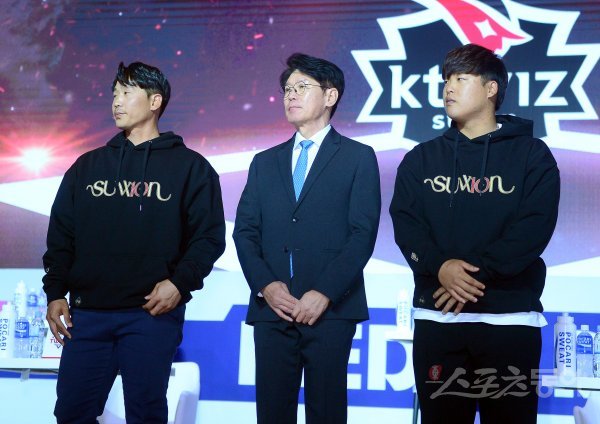 2023 신한은행 SOL KBO 미디어데이가 30일 서울 그랜드하얏트 호텔에서 열렸다. KT 박경수, 이강철 감독, 강백호가 인사를 하고 있다.