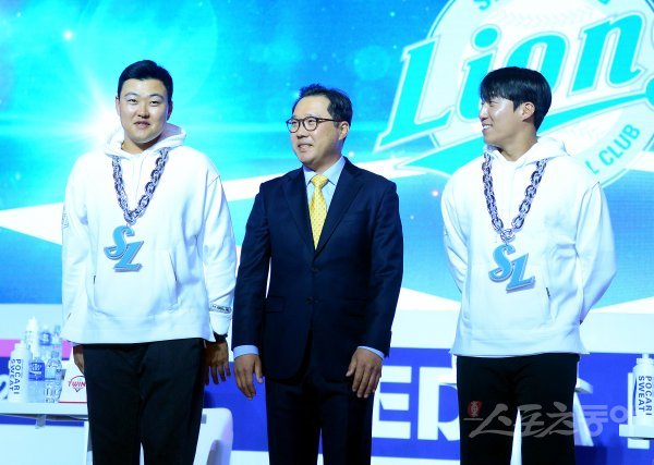 2023 신한은행 SOL KBO 미디어데이가 30일 서울 그랜드하얏트 호텔에서 열렸다. 삼성 오재일, 박진만 감독, 원태인이 인사를 하고 있다.