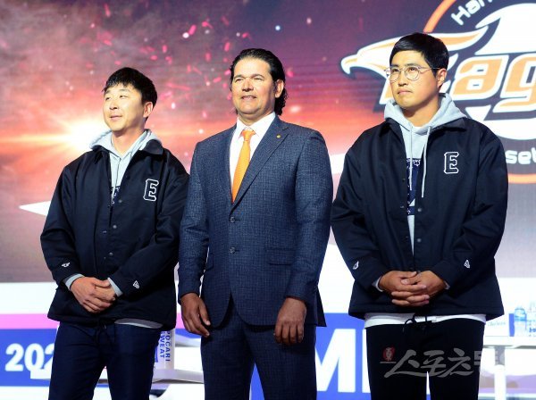 2023 신한은행 SOL KBO 미디어데이가 30일 서울 그랜드하얏트 호텔에서 열렸다. 한화 정우람, 수베로 감독, 채은성이 인사를 하고 있다.