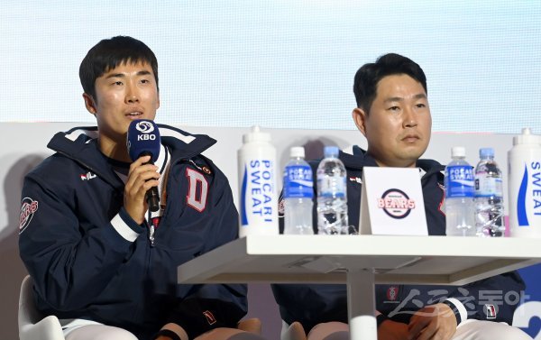 2023 신한은행 SOL KBO 미디어데이가 30일 서울 그랜드하얏트 호텔에서 열렸다. 두산 허경민과 양의지가 취재진의 질문에 대답하고 있다.