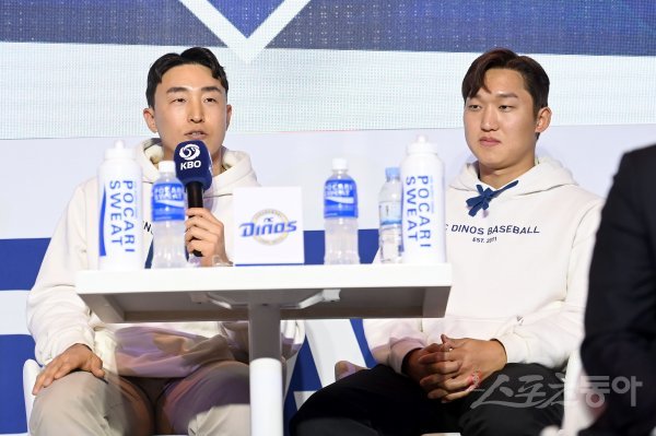 2023 신한은행 SOL KBO 미디어데이가 30일 서울 그랜드하얏트 호텔에서 열렸다. NC 손아섭과 구창모가 취재진의 질문에 대답하고 있다.