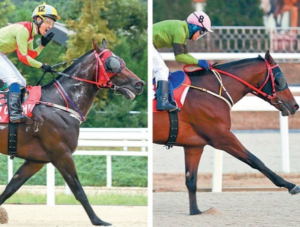 4월 2일 렛츠런파크 부산경남 6경주로 열리는 ‘부산일보배 대상경주’에서 유력한 우승마로 꼽히는 어마어마(왼쪽)와 라온더파이터. 사진제공 l 한국마사회