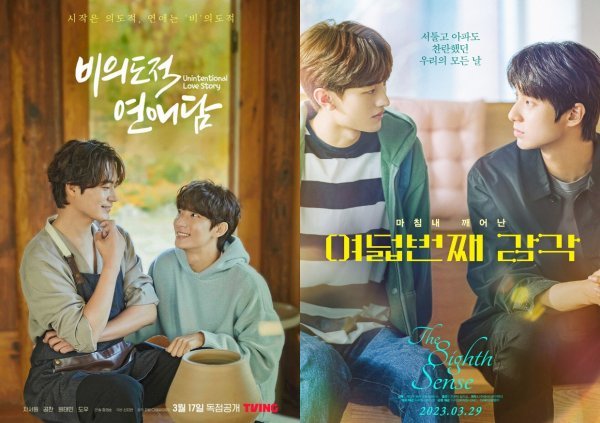 티빙 오리지널 시리즈 ‘비의도적 연애담’, 영화 ‘여덟번째 감각’(왼쪽부터) 등이 남성 동성애 코드로 팬덤 공략에 나선다. 사진제공|티빙·플레이그램