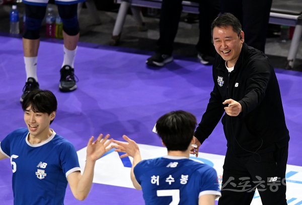 30일 인천 계양체육관에서 ‘2022-2023 도드람 V리그’ 인천 대한항공과 천안 현대캐피탈의 남자부 챔피언결정전 경기가 열렸다. 현대캐피탈 허수봉의 득점에 최태웅 감독이 미소를 짓고 있다.