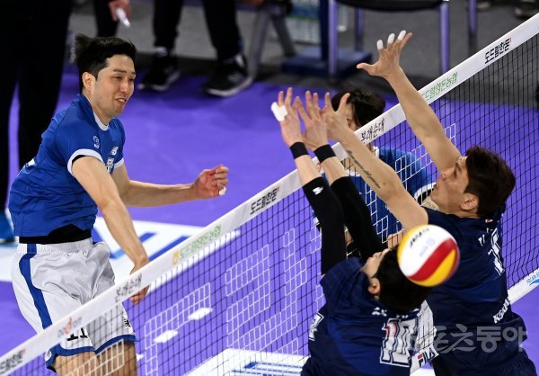 30일 인천 계양체육관에서 ‘2022-2023 도드람 V리그’ 인천 대한항공과 천안 현대캐피탈의 남자부 챔피언결정전 경기가 열렸다. 현대캐피탈 최민호가 대한항공 블로커를 피해 공격을 펼치고 있다.