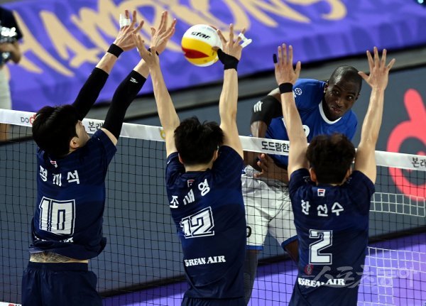 30일 인천 계양체육관에서 ‘2022-2023 도드람 V리그’ 인천 대한항공과 천안 현대캐피탈의 남자부 챔피언결정전 경기가 열렸다. 현대캐피탈 오레올이 대한항공 블로커를 피해 스파이크를 날리고 있다.