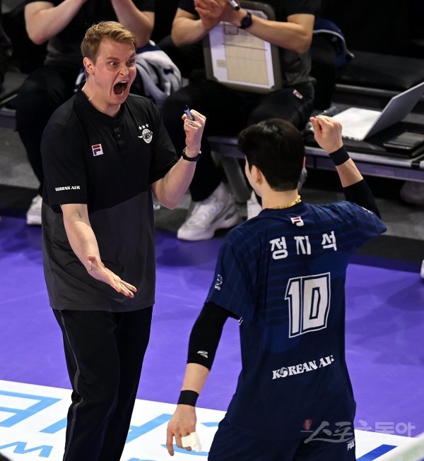 30일 인천 계양체육관에서 ‘2022-2023 도드람 V리그’ 인천 대한항공과 천안 현대캐피탈의 남자부 챔피언결정전 경기가 열렸다. 대한항공 정지석의 득점에 틸리카이넨 감독이 환호하고 있다.