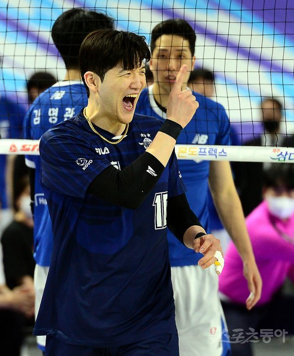 30일 인천 계양체육관에서 ‘2022-2023 도드람 V리그’ 인천 대한항공과 천안 현대캐피탈의 남자부 챔피언결정전 경기가 열렸다. 대한항공 정지석이 득점을 올린 후 환호하고 있다.