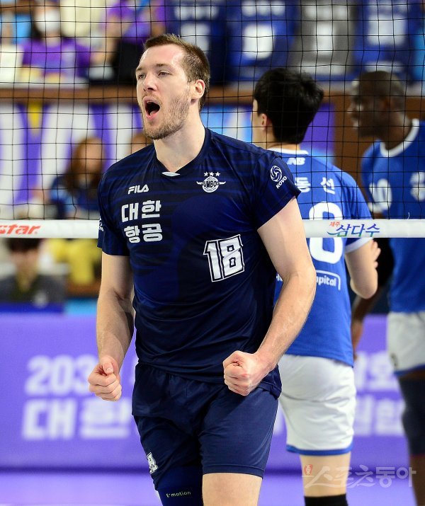 30일 인천 계양체육관에서 ‘2022-2023 도드람 V리그’ 인천 대한항공과 천안 현대캐피탈의 남자부 챔피언결정전 경기가 열렸다. 대한항공 링컨이 득점을 올린 후 환호하고 있다.