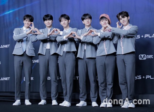 연습생 김규빈, 박건욱, 유승언, 윤종우, 타쿠토, 히로토가 29일 오후 서울 마포구 CJ E&M CENTER에서 열린 Mnet ‘보이즈 플래닛’ 28인 생존자 신고식에서 포즈를 취하고 있다.