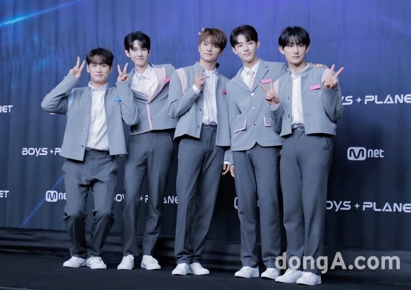연습생 금준현, 올리, 왕즈하오, 장하오, 하루토가 29일 오후 서울 마포구 CJ E&M CENTER에서 열린 Mnet ‘보이즈 플래닛’ 28인 생존자 신고식에서 포즈를 취하고 있다.