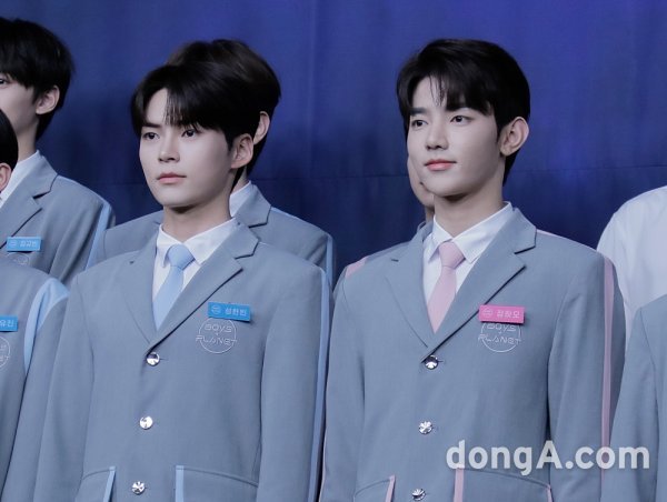 연습생 성한빈, 장하오가 29일 오후 서울 마포구 CJ E&M CENTER에서 열린 Mnet ‘보이즈 플래닛’ 28인 생존자 신고식에서 포즈를 취하고 있다.