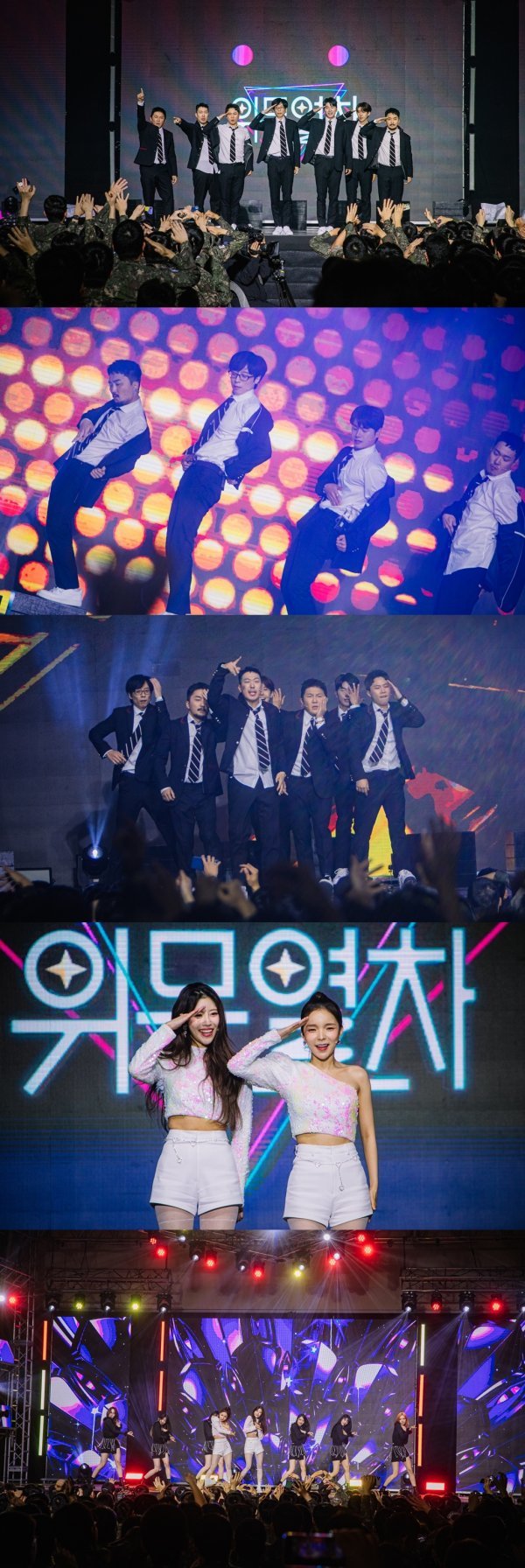 공개된 사진 속에는 군부대를 발칵 뒤집은 원탑과 주주 시크릿의 모습이 담겨 있어 눈길을 끈다. 특히 원탑은 사람들 앞에서 공연을 하는 것이 이번이 처음. 그것도 국군 장병들 앞에서 첫 무대를 선보이게 됐다. 보이그룹의 필수 무대 의상 교복을 맞춰 입고 ‘To You(투유)’ 군무를 추고 있는 원탑의 모습에 과연 국군 장병들은 어떤 반응을 보일지 관심이 집중된다.