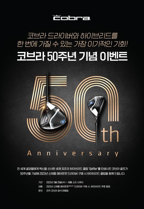 글로벌 스포츠 브랜드 푸마(PUMA)가 전개하는 골프 클럽 브랜드 ‘코브라골프(COBRA GOLF)’가 브랜드 론칭 50주년을 맞아 기념 이벤트를 진행한다고 3일 밝혔다. 2023년 신제품 에어로젯 드라이버를 구입하면 에어로젯 하이브리드를 사은품으로 제공한다. 이벤트는 제품 소진 시까지 전국 코브라골프 공식 판매점에서 진행된다.