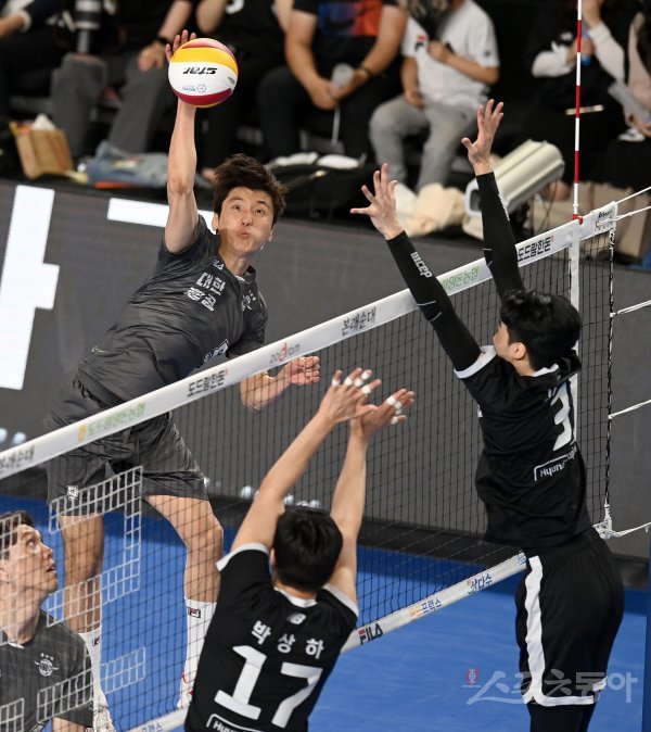 3일 천안 유관순체육관에서 열린 ‘2022~2023 도드람 V-리그’ 남자부 챔피언결정전 3차전 현대캐피탈과 대한항공 경기에서 대한항공 곽승석이 현대캐피탈의 블로킹 사이로 스파이크를 날리고 있다.