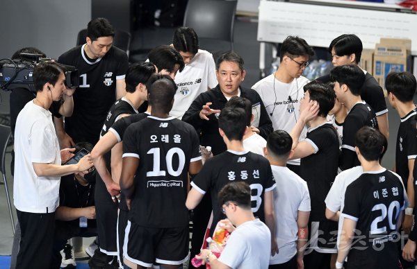 3일 천안 유관순체육관에서 열린 ‘2022~2023 도드람 V-리그’ 남자부 챔피언결정전 3차전 현대캐피탈과 대한항공 경기에서 현대캐피탈 최태웅 감독이 작전 지시를 하고 있다.