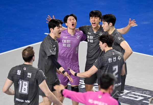 3일 천안 유관순체육관에서 열린 ‘2022~2023 도드람 V-리그’ 남자부 챔피언결정전 3차전 현대캐피탈과 대한항공 경기에서 대한항공 곽승석이 득점에 성공한 후 기뻐하고 있다.