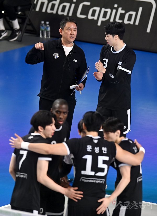 3일 천안 유관순체육관에서 열린 ‘2022~2023 도드람 V-리그’ 남자부 챔피언결정전 3차전 현대캐피탈과 대한항공 경기에서 현대캐피탈 최태웅 감독이 김명관에게 작전 지시를 하고 있다.