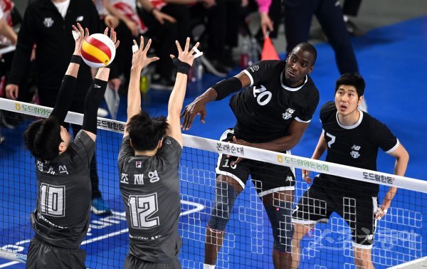 3일 천안 유관순체육관에서 열린 ‘2022~2023 도드람 V-리그’ 남자부 챔피언결정전 3차전 현대캐피탈과 대한항공 경기에서 현대캐피탈 오레올이 대한항공의 블로킹 사이로 스파이크를 날리고 있다.