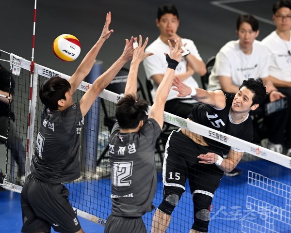 3일 천안 유관순체육관에서 열린 ‘2022~2023 도드람 V-리그’ 남자부 챔피언결정전 3차전 현대캐피탈과 대한항공 경기에서 현대캐피탈 문성민이 대한항공의 블로킹 사이로 스파이크를 날리고 있다.