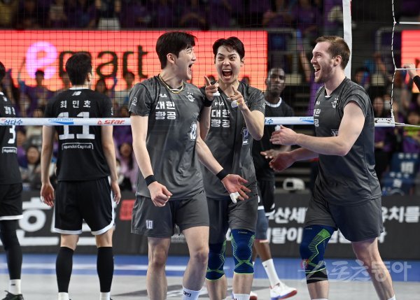 3일 천안 유관순체육관에서 열린 ‘2022~2023 도드람 V-리그’ 남자부 챔피언결정전 3차전 현대캐피탈과 대한항공 경기에서 대한항공 정지석이 득점에 성공한 후 조재영, 링컨과 기뻐하고 있다.