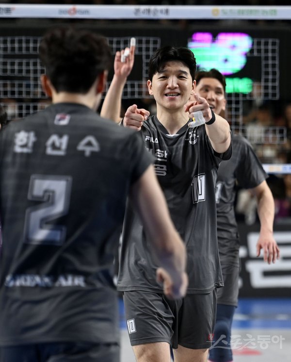 3일 천안 유관순체육관에서 열린 ‘2022~2023 도드람 V-리그’ 남자부 챔피언결정전 3차전 현대캐피탈과 대한항공 경기에서 대한항공 정지석이 득점에 성공한 후 기뻐하고 있다.