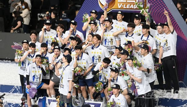 3일 천안 유관순체육관에서 열린 ‘2022~2023 도드람 V-리그’ 남자부 챔피언결정전 3차전 현대캐피탈과 대한항공 경기에서 대한항공이 세트스코어 3-2 역전승을 거두며 3년 연속 통합 우승을 달성했다.