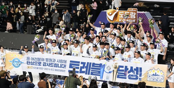 3일 천안 유관순체육관에서 열린 ‘2022~2023 도드람 V-리그’ 남자부 챔피언결정전 3차전 현대캐피탈과 대한항공 경기에서 대한항공이 세트스코어 3-2 역전승을 거두며 3년 연속 통합 우승을 달성했다.