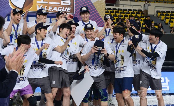 3일 천안 유관순체육관에서 열린 ‘2022~2023 도드람 V-리그’ 남자부 챔피언결정전 3차전 현대캐피탈과 대한항공 경기에서 대한항공이 세트스코어 3-2 역전승을 거두며 3년 연속 통합 우승을 달성했다. MVP에 선정된 한선수가 동표들의 축하를 받고 있다.