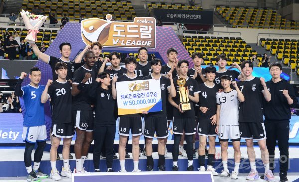 3일 천안 유관순체육관에서 열린 ‘2022~2023 도드람 V-리그’ 남자부 챔피언결정전 3차전 현대캐피탈과 대한항공 경기에서 패하며 준우승을 차지한 현대캐피탈 선수들이 기념촬영을 하고 있다.