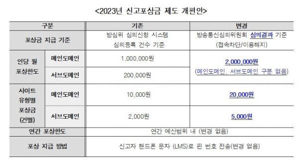 단, 건별로는 사이트 유형에 따라 포상금의 차이가 있다. 메인 도메인의 경우, 건당 1만 원에서 2만 원으로 2배 상향됐고, 서브 도메인 역시 기존 2000원에서 5000원으로 지급 기준이 대폭 올랐다.
