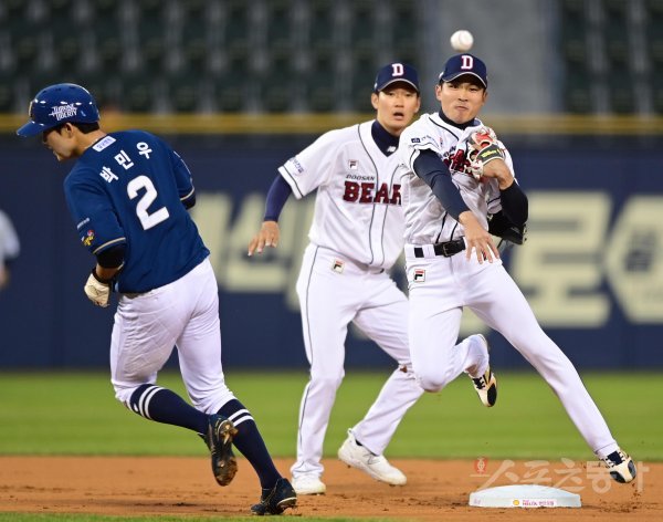 4일 서울 잠실야구장에서 열린 ‘2023 신한은행 SOL KBO리그’ 두산 베어스와 NC 다이노스의 경기에서 1회초 1사 1루 NC의 내야 땅볼 때 두산 2루수 이유찬이 1루주자를 포스 아웃시킨 후 1루로 송구하고 있다.