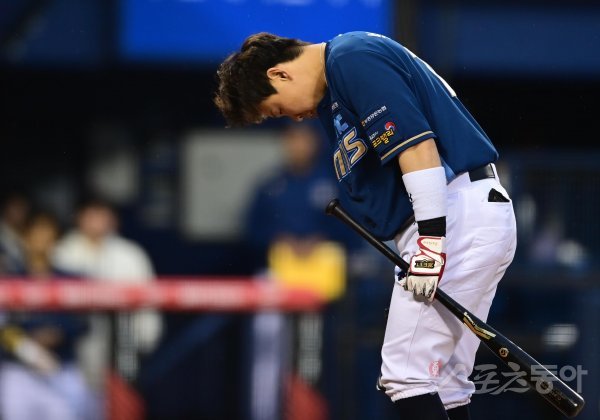 4일 서울 잠실야구장에서 열린 ‘2023 신한은행 SOL KBO리그’ 두산 베어스와 NC 다이노스의 경기에서 1회초 무사 1루 NC 박세혁이 타석에 들어서기 전 팬들에게 인사하고 있다.