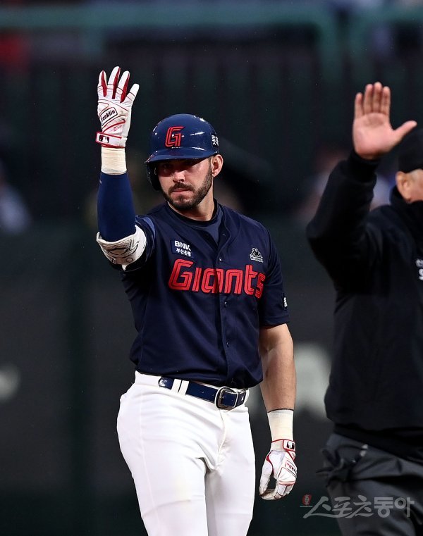 4일 인천 SSG 랜더스필드에서 ‘2023 신한은행 SOL KBO리그’ SSG 랜더스와 롯데 자이언츠의 경기가 열렸다. 1회초 1사 2루에서 롯데 렉스가 1타점 2루타를 날린 후 환호하고 있다.