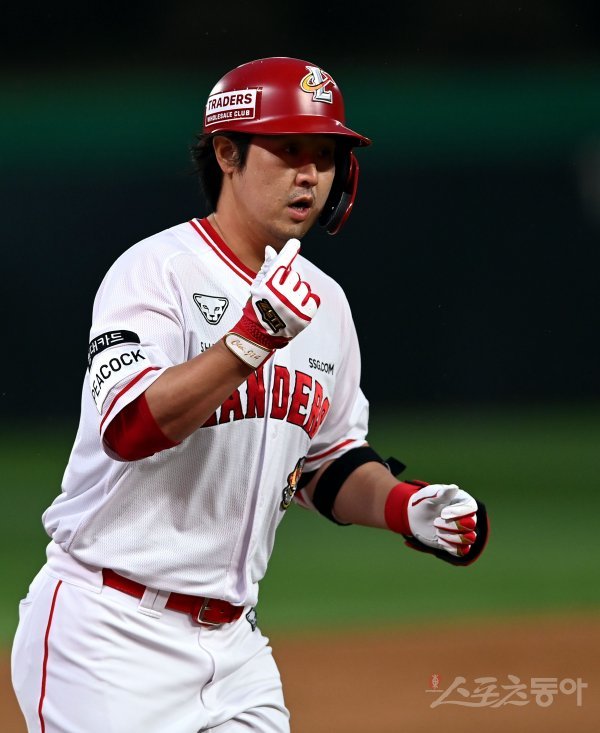 4일 인천 SSG 랜더스필드에서 ‘2023 신한은행 SOL KBO리그’ SSG 랜더스와 롯데 자이언츠의 경기가 열렸다. 1회말 1사 1루에서 SSG 최정이 홈런을 날린 후 그라운드를 돌며 세리머니를 펼치고 있다. 롯데의 비디오판독 요청으로 홈런에서 2루타로 번복됐다.