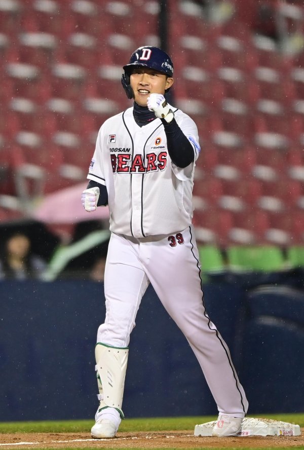 4일 서울 잠실야구장에서 열린 ‘2023 신한은행 SOL KBO리그’ 두산 베어스와 NC 다이노스의 경기에서 8회말 2사 1루 두산 김인태가 선제 1타점 중전 3루타를 친 후 기뻐하고 있다.
