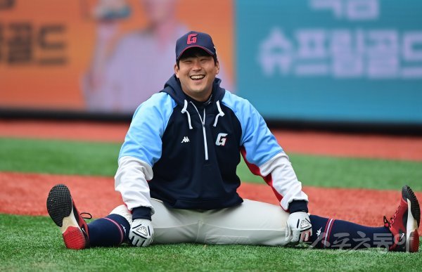6일 인천 SSG랜더스필드에서 열린 ‘2023 신한은행 SOL KBO리그’ SSG 랜더스와 롯데 자이언츠의 경기에 앞서 롯데 유강남이 몸을 풀며 웃고 있다.