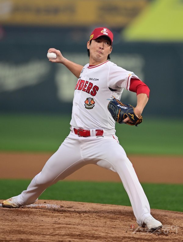 6일 인천 SSG랜더스필드에서 열린 ‘2023 신한은행 SOL KBO리그’ SSG 랜더스와 롯데 자이언츠의 경기에서 선발 투수로 마운드에 오른 SSG 문승원이 역투하고 있다.