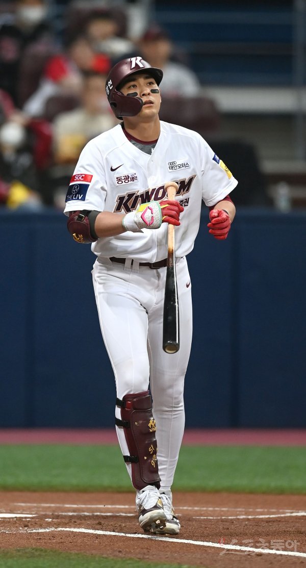 6일 서울 고척스카이돔에서 ‘2023 신한은행 SOL KBO리그’ LG 트윈스와 키움 히어로즈 경기가 열렸다. 1회말 1사 1루 키움 이정후가 볼넷으로 출루하고 있다.