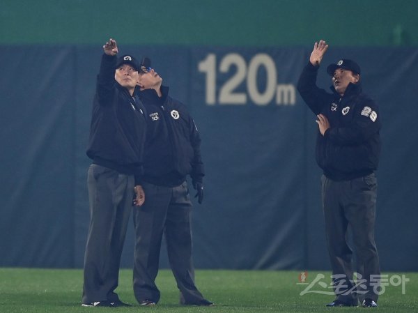 6일 인천 SSG랜더스필드에서 열린 ‘2023 신한은행 SOL KBO리그’ SSG 랜더스와 롯데 자이언츠의 경기에서 심판들이 우천으로 중단된 그라운드를 살피고 있다.