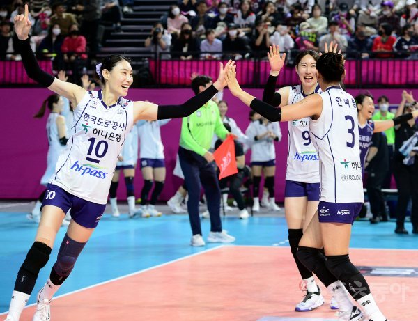 6일 인천 삼산월드체육관에서 ‘2022-2023 도드람 V리그’ 인천 흥국생명과 김천 한국도로공사의 여자부 챔피언결정전 5차전 경기가 열렸다. 한국도로공사가 3세트를 승리한 후 선수들이 기쁨을 나누고 있다.