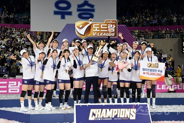 6일 인천 삼산월드체육관에서 ‘2022-2023 도드람 V리그’ 인천 흥국생명과 김천 한국도로공사의 여자부 챔피언결정전 5차전 경기가 열렸다. 한국도로공사가 흥국생명을 꺾고 우승을 차지한 후 김종민 감독 및 선수들이 기념촬영을 하고 있다.