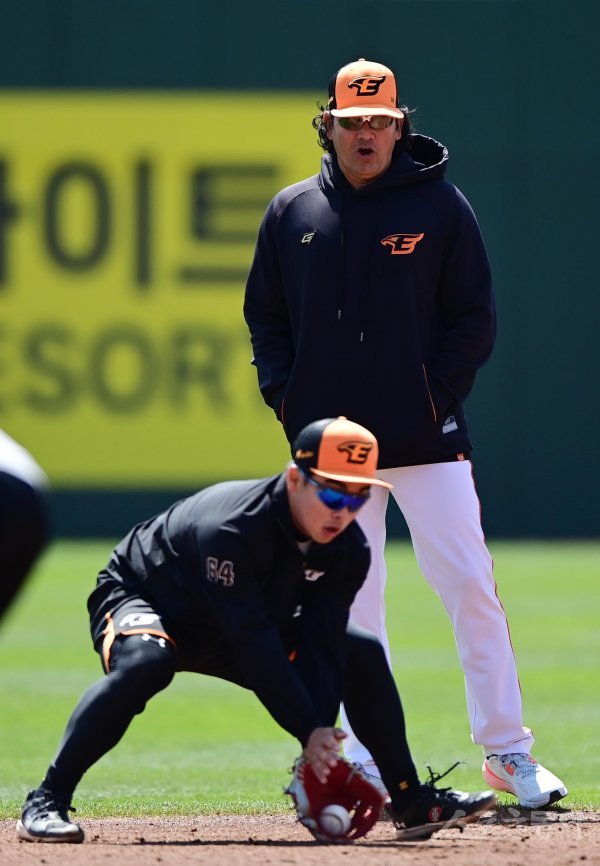9일 대전 한화생명이글스파크에서 열린 ‘2023 신한은행 SOL KBO리그’ 한화 이글스와 SSG 랜더스의 경기에 앞서 한화 수베로 감독이 선수들의 훈련을 지켜보고 있다.