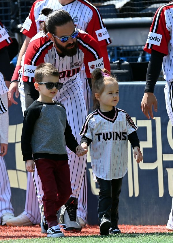 9일 서울 잠실야구장에서 ‘2023 신한은행 SOL KBO리그’ LG 트윈스와 삼성 라이온즈의 경기가 열렸다. 경기 전 LG 켈리가 가족과 함께 즐거운 시간을 보내고 있다.