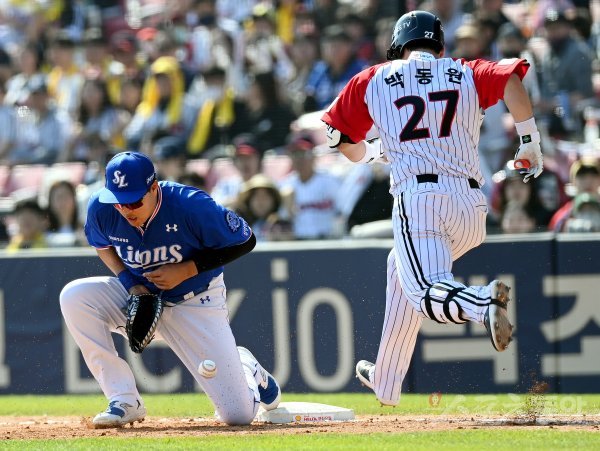 9일 서울 잠실야구장에서 ‘2023 신한은행 SOL KBO리그’ LG 트윈스와 삼성 라이온즈의 경기가 열렸다. 5회말 무사에서 내야땅볼 때 LG 박동원이 3루수 송구 실책으로 세이프되고 있다.