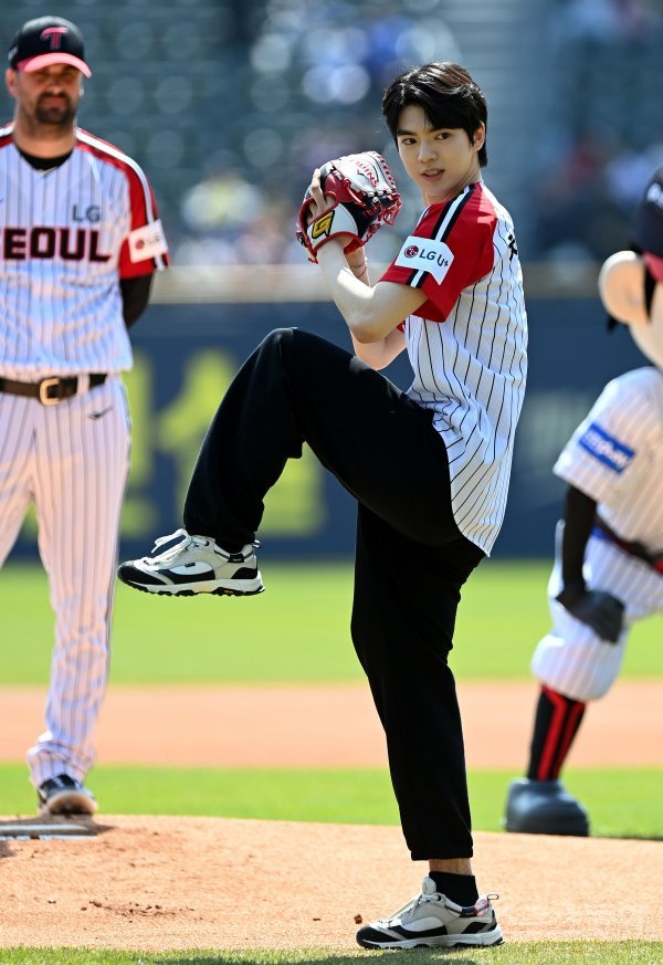 9일 서울 잠실야구장에서 ‘2023 신한은행 SOL KBO리그’ LG 트윈스와 삼성 라이온즈의 경기가 열렸다. 경기에 앞서 남자피겨 차준환이 시구를 던지고 있다.