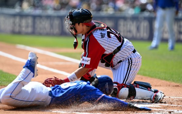 9일 서울 잠실야구장에서 ‘2023 신한은행 SOL KBO리그’ LG 트윈스와 삼성 라이온즈의 경기가 열렸다. 1회초 2사 1루에서 2루타 때 삼성 김지찬이 LG 박동원의 태그에 앞서 득점을 올리고 있다.