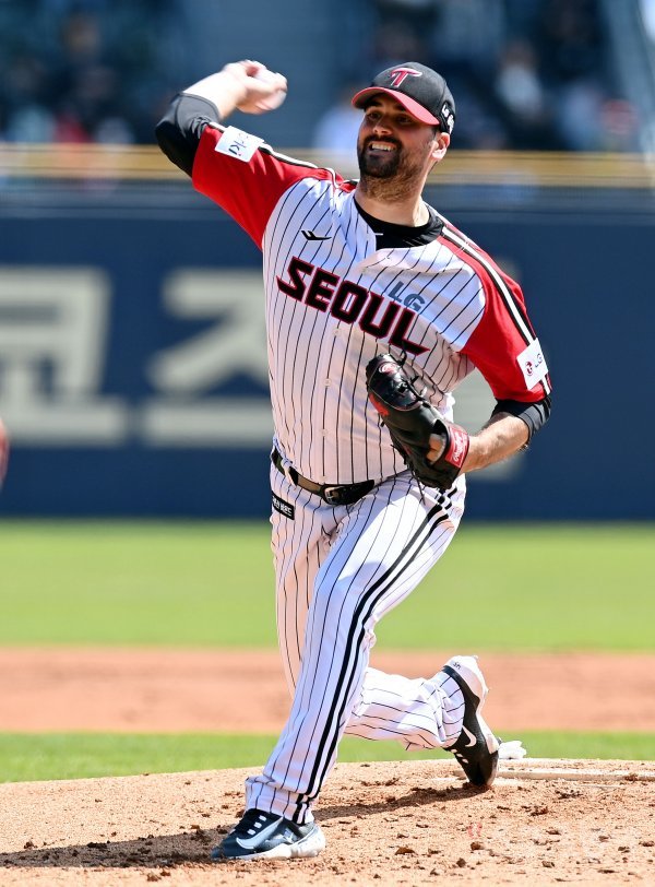 9일 서울 잠실야구장에서 ‘2023 신한은행 SOL KBO리그’ LG 트윈스와 삼성 라이온즈의 경기가 열렸다. LG 선발투수 플럿코가 힘차게 볼을 던지고 있다.